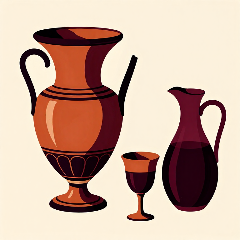 Greek wine was almost never drunk undiluted (akratos) — this was considered barbaric. Standard practice was to mix wine with water in a large communal bowl called a krater at ratios ranging from 1:3 (strong) to 1:5 (mild). The symposiarch (drinking master) determined the mixing ratio based on the occasion. Pour the diluted wine from the krater into individual drinking cups (kylikes). Greek wines were considerably stronger than modern wines, possibly reaching 15-16% ABV due to the warm climate and high sugar content of Mediterranean grapes, which is why dilution was standard practice. Wine was also flavored with honey, herbs, or seawater in various regional traditions. The symposium (drinking party) was a central institution of Greek social and intellectual life, where philosophy, poetry, and politics were discussed over diluted wine.
