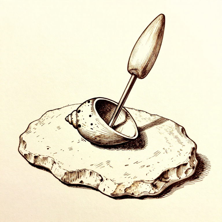 Each bead or pendant needs a hole for threading onto cordage. Place the shell or bone piece on a flat stone as a drilling platform. Using a flint burin or a small, sharp flint point, rotate the drill between your palms while pressing down on the shell. Drill slowly — too much pressure cracks delicate shells. For thin shells like Nassarius, drilling from one side is sufficient. For thicker bone beads or teeth, drill from both sides to meet in the middle, preventing blow-out chips. The hole needs to be just large enough for your cordage to pass through — about 1-2 mm diameter.