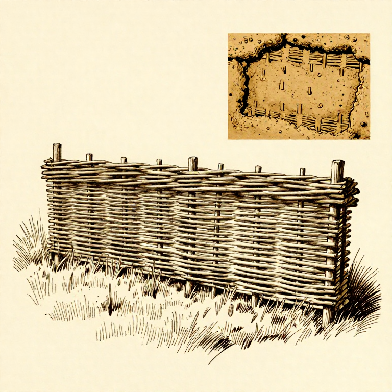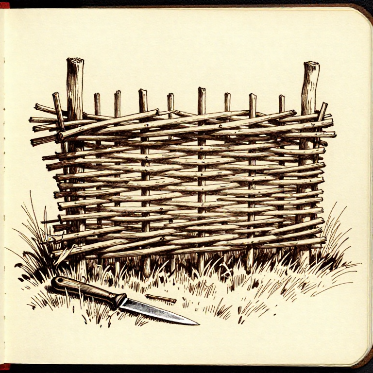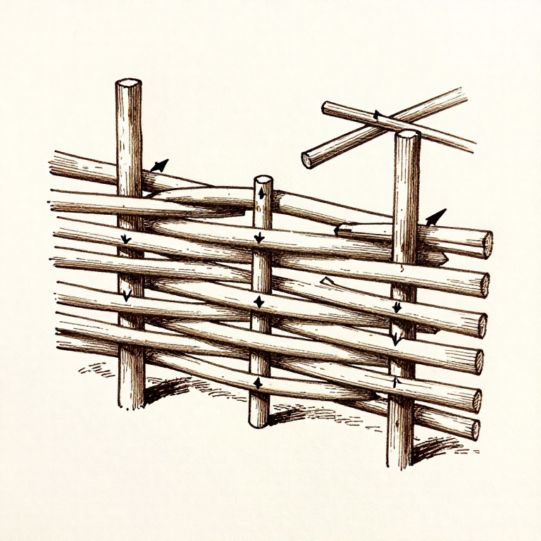 Build a wattle fence by weaving flexible rods between upright stakes. Wattle is one of the oldest construction techniques, used for fencing, walls, and animal enclosures since the Neolithic period. The technique requires no fasteners — the tension of the woven rods holds the structure together. Wattle panels from the Somerset Levels in England date to around 3800 BCE.