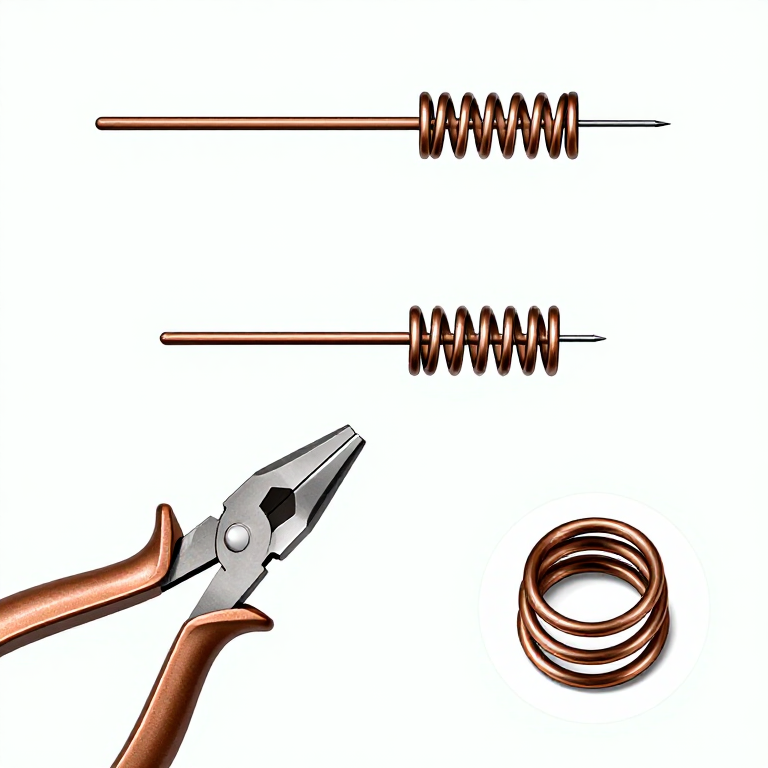 At one end of the wire, use round-nose pliers to wind a tight coil of 2-4 turns — this is the spring that provides the tension to hold the pin closed. Wind the coil around a mandrel (a small rod or the plier jaws) to create uniform, tight turns approximately 4-5 mm in diameter. The spring is the functional heart of the fibula — it stores elastic energy that pushes the pin point into the catch plate when the fibula is closed. After winding the spring, the wire should exit tangentially from the coil, forming the beginning of the pin shaft. The remaining longer section of wire will form the bow (arch) and catch plate.