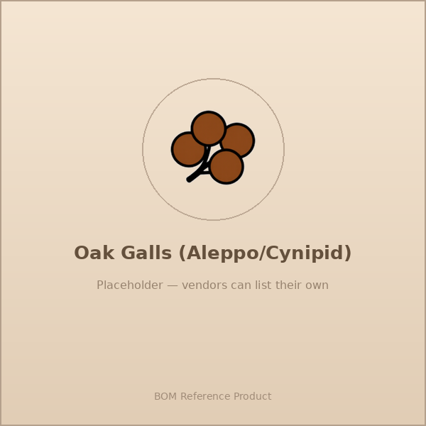 Oak galls are abnormal growths on oak trees caused by cynipid wasps (Cynips gallae-tinctoriae and related species) laying eggs in the leaf buds. The tree surrounds the larva with a hard, round growth rich in tannic acid (gallotannin), which can comprise 50-70% of the gall's dry weight. Aleppo galls (from Quercus infectoria, found in Turkey and the Middle East) are historically the gold standard because of their extremely high tannin content. European oak galls from Quercus robur or Quercus petraea also work well. Collect galls that are hard, dry, and brown — green galls still contain the live larva and have lower tannin. You can also purchase dried oak galls from calligraphy or natural dye suppliers.