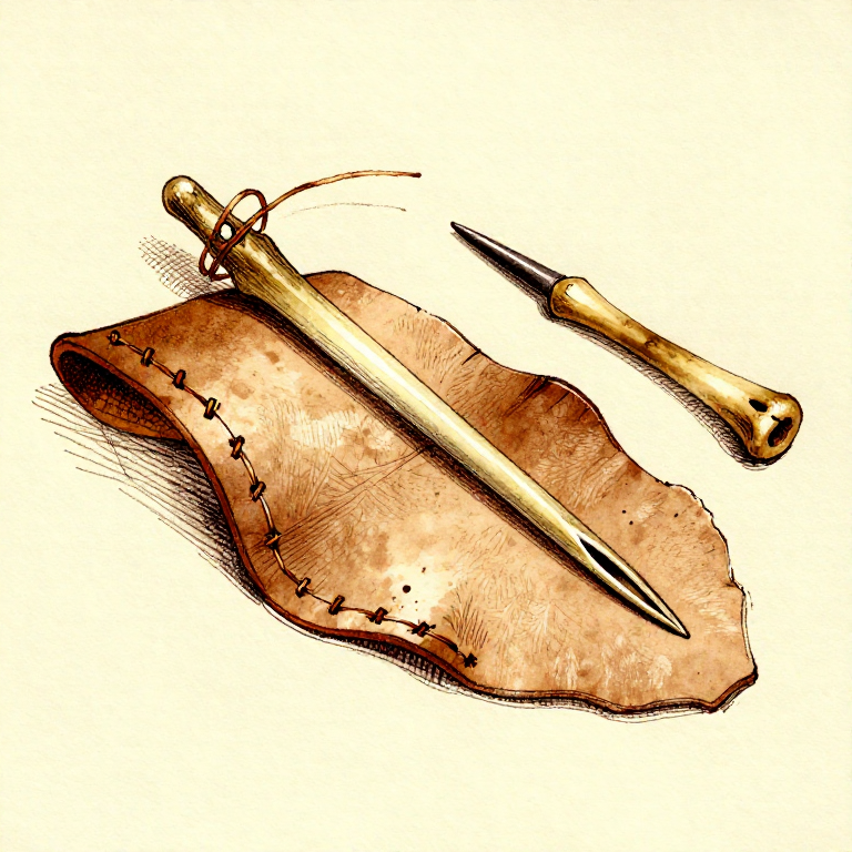 Craft a functional sewing needle from a splinter of dense animal bone. Bone needles with eyes appear in the archaeological record by at least 40,000 years ago and enabled the creation of fitted clothing, which was critical for human survival in cold climates during the last Ice Age.