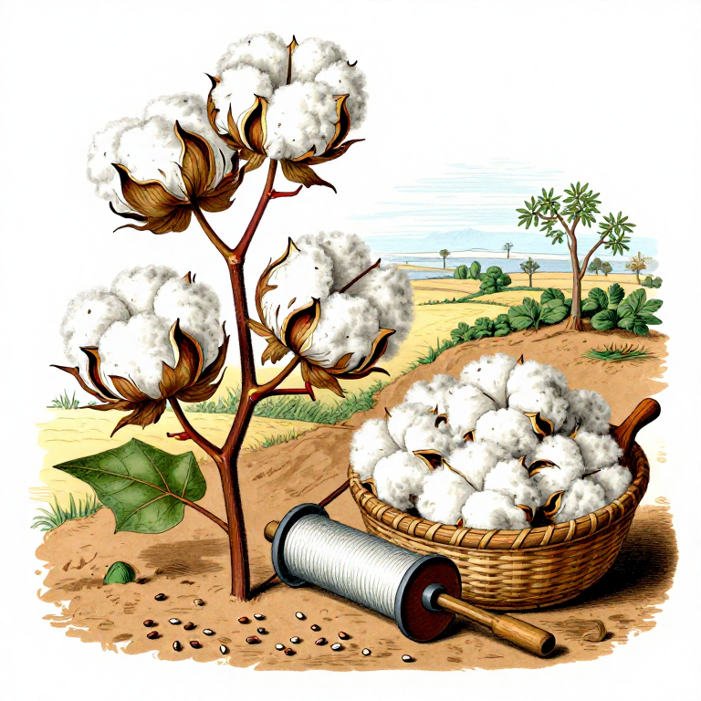 गुजरात भारत का सबसे बड़ा कपास उत्पादक राज्य है, जो देश के कुल कपास उत्पादन का लगभग 35% है। यह खाका गुजरात में कपास (Gossypium) की हाथ से कटाई और पारंपरिक जिनिंग (चरखी का उपयोग करके फाइबर और बीज को अलग करना) की पूरी प्रक्रिया की व्याख्या करता है।