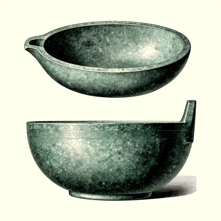 Plan the vessel shape on the stone surface using a sharp point or charcoal. An oval or rectangular plan is easier to carve than circular. Mark the wall thickness — aim for approximately 1.5-2cm walls with a slightly thicker bottom (2-3cm) for durability. Mark a pouring spout location if desired.