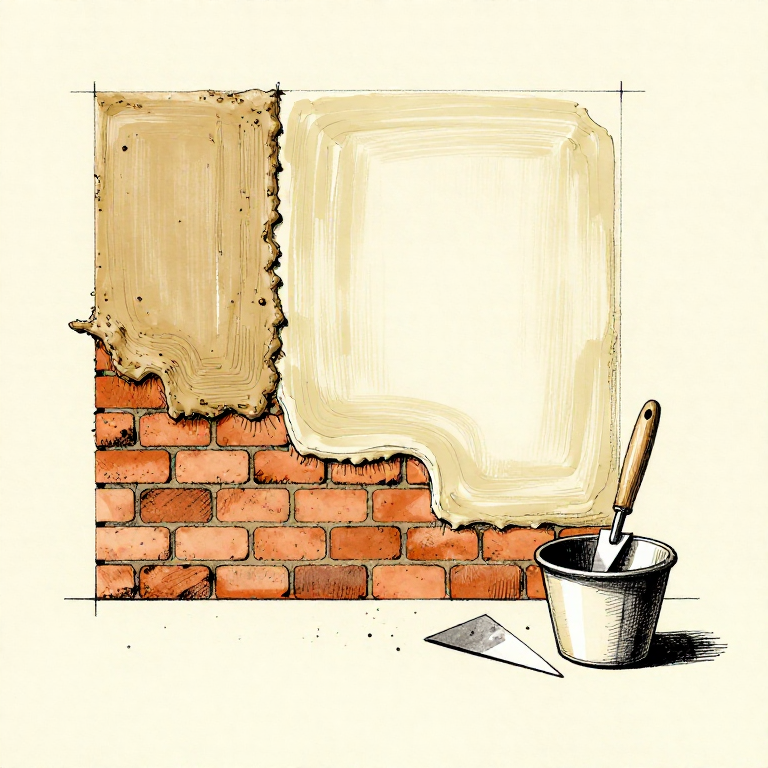 Apply the plaster to a dampened wall surface using a flat trowel (a smooth stone, wooden blade, or metal tool). Apply in multiple thin coats (5-10 mm each), allowing each coat to partially set before applying the next. The plaster sets and hardens through carbonation — atmospheric carbon dioxide reacts with the calcium hydroxide over weeks to months, converting it back to calcium carbonate: Ca(OH)2 + CO2 -> CaCO3 + H2O. This completes the lime cycle — the plaster has returned to the same chemical composition as the original limestone, but in a smooth, hard, continuous coating. Lime plaster is naturally white, breathable (allowing moisture to pass through), mildly antiseptic (alkaline pH kills bacteria), and remarkably durable — lime-plastered floors at Neolithic sites in the Levant have survived over 9,000 years.