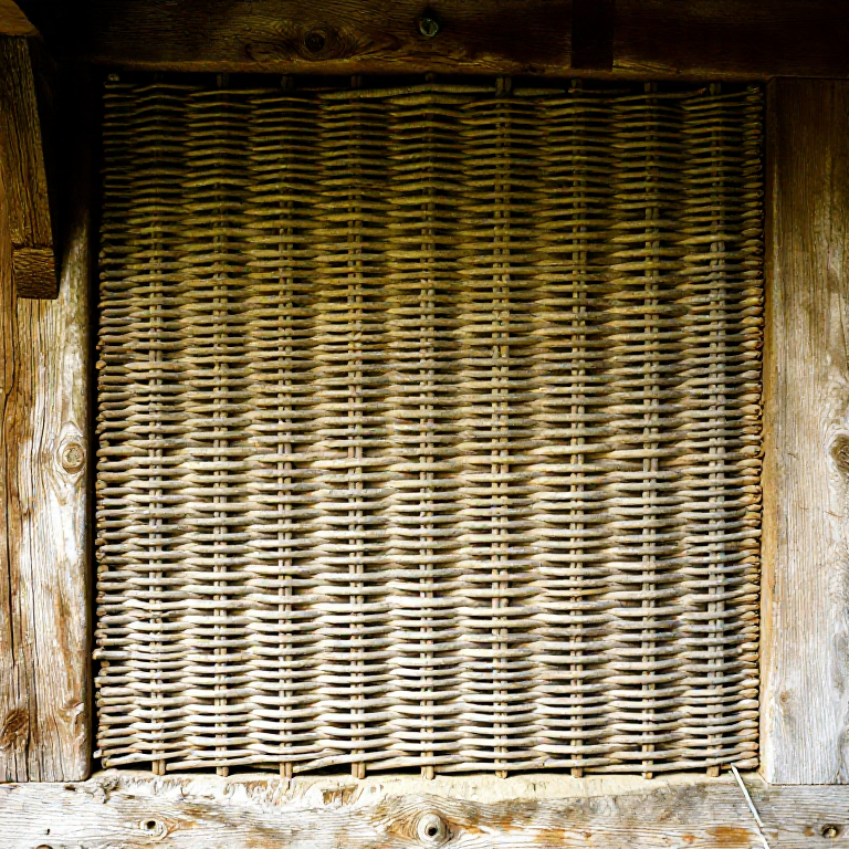 Within the timber frame, drill or chisel holes approximately 3 to 4 cm in diameter into the top and bottom horizontal timbers (rails) at intervals of 15 to 20 cm. Drive vertical staves (stout sticks approximately 2 to 3 cm diameter) into these holes to create an upright framework. Then weave flexible rods (hazel or willow, approximately 1 to 2 cm diameter) horizontally between the staves in a basket-weave pattern — over one stave, under the next, alternating with each row. Pack the horizontal rods tightly together to create a dense lattice. The woven wattle should fill the entire panel area within the timber frame and be sturdy enough to support the weight of the wet daub on both sides without bulging. Soak the rods in water before weaving if they are too stiff to bend without breaking.