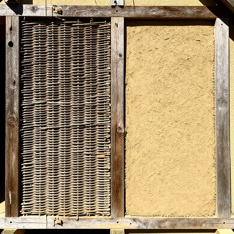 Wattle and daub was the most common wall infill material in medieval timber-frame buildings across Europe. Wattle (a lattice of interwoven sticks or split hazel rods) was fixed within the timber frame, then coated on both sides with daub — a mixture of clay, straw, sand, and often animal dung or horsehair. The result was a solid, weather-resistant wall that was inexpensive to build using locally available materials. This blueprint covers weaving the wattle and applying the daub.