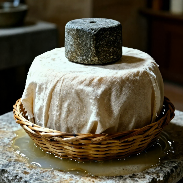 Sprinkle salt over the drained curds and gently fold it through — salt seasons the cheese and draws out additional whey, improving both flavour and keeping quality. Gather the cheesecloth around the curds and twist to form a compact round shape. Place the wrapped cheese in the mould and set a weight of 0.5 to 1 kg on top. Press for 1 to 2 hours, flipping the cheese once halfway through to ensure even pressing. The pressure expels more whey and compacts the curds into a cohesive mass. For a softer, more moist cheese (closer to ricotta), press for only 30 minutes with light weight. For a firmer cheese (closer to paneer), press for 2 hours with heavier weight. Columella describes both soft and firm fresh cheeses for different culinary purposes.