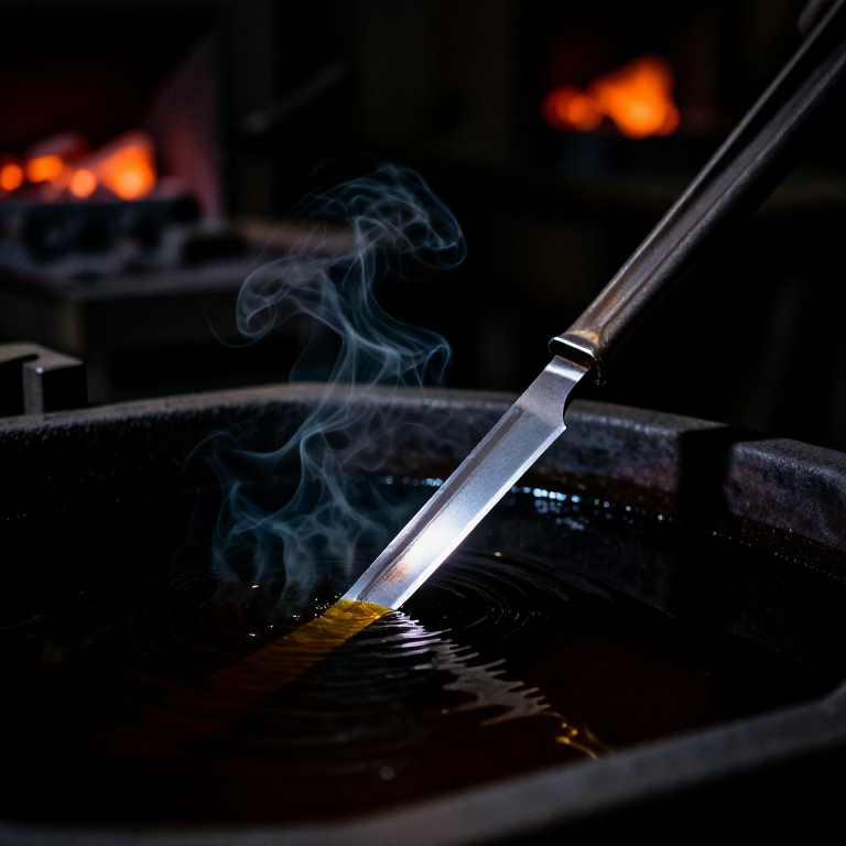 Heat the blade evenly to its critical temperature — for 0.5-0.7% carbon steel this is approximately 780-820 °C, visible as a cherry red that is non-magnetic (test with a magnet). Quench the blade edge-first into warm oil (approximately 50 °C), plunging it in smoothly and straight to minimise warping. Hold it submerged for at least 30 seconds, moving it gently in a figure-eight pattern. The blade is now fully hardened but extremely brittle. Temper immediately by placing the cleaned blade in an oven at 220-250 °C for one hour, or heat the spine with a torch until a straw-yellow oxide colour (approximately 220 °C) appears on the flat of the blade. This reduces brittleness while retaining edge hardness sufficient for combat use. Roman swords show Vickers hardness values of approximately 200-350 HV in archaeological samples, indicating they were tempered to a practical balance of hardness and toughness.