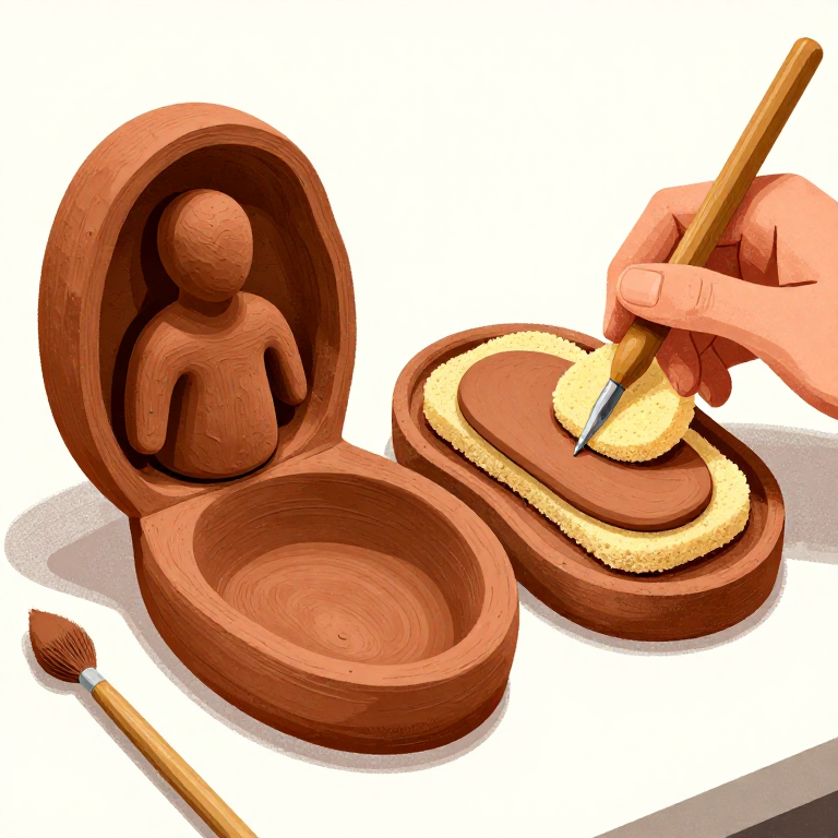 Model an original figurine (the archetype) in clay, approximately 15-25 cm tall. Once satisfied with the form, create a two-piece mold by pressing the front half of the figure into a thick slab of firm clay (or plaster), allowing it to set, then repeating for the back half. The mold halves must have registration marks (keys) so they align precisely when reassembled. Allow the mold to dry thoroughly and fire it to create a durable, reusable press mold. Greek workshops kept libraries of molds and could produce hundreds of figurines from a single mold set. Different heads, arms, and accessories could be mixed and matched between mold sets to create variety from a limited number of molds — an ancient precursor to modular manufacturing.