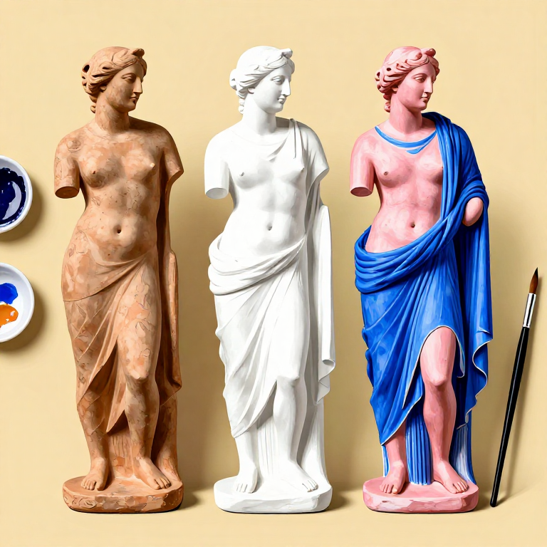 Coat the entire fired figurine with a thin layer of white kaolin slip and allow it to dry. This white ground provides a bright, uniform base for polychrome painting, similar to gesso on canvas. Using fine brushes, paint the figurine with mineral pigments mixed with a binding medium such as egg tempera or gum arabic: blue (Egyptian blue) for drapery, pink (rose madder or dilute red ochre) for skin, yellow ochre for hair, and red for details. The original polychrome painting on Tanagra figurines is largely lost from surviving examples, but traces of pigment and modern analysis confirm they were vibrantly colored. These figurines were placed in graves as offerings, displayed in homes as decoration, and dedicated at sanctuaries, serving as affordable alternatives to large-scale marble sculpture.