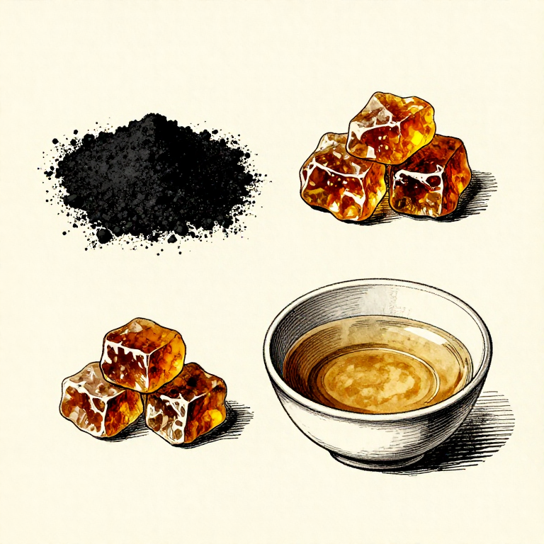 Dissolve gum arabic in a small amount of warm water. Gum arabic is the dried sap of Acacia senegal and related species, widely available across North Africa and the Near East. It dissolves readily in water to form a slightly viscous, transparent solution. If gum arabic is unavailable, other plant gums work as substitutes: gum tragacanth, honey, or egg white (glair) were all used historically. The binder serves two functions: it suspends the carbon particles evenly in the liquid and it adheres the ink to the writing surface once dry.