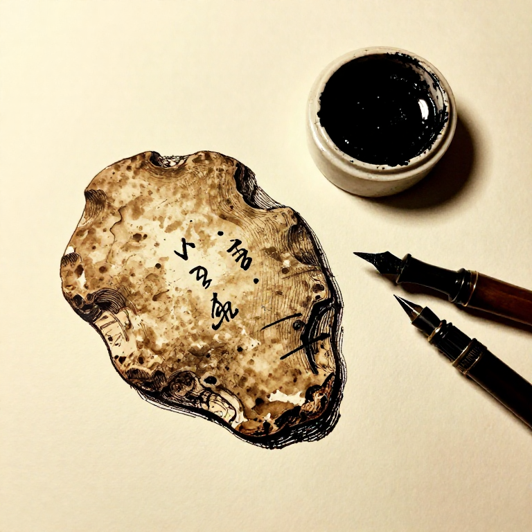 Place the collected soot on a flat stone (a grinding palette) and add the gum arabic solution gradually. Grind the mixture with a small round stone (muller) using a circular motion, working the soot into the binder thoroughly. The grinding breaks up any clumps of carbon and disperses the particles evenly through the gum solution. Continue grinding for 10-15 minutes — the longer you grind, the smoother and more uniform the ink. Add water drop by drop to achieve the desired consistency: thick and paste-like for brush writing, more fluid for reed pen use. The ratio is approximately 1 part soot to 1 part gum arabic solution by volume.