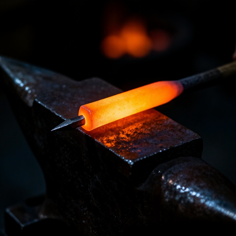 Heat the end of a square iron rod to bright orange (approximately 1000 °C) in the forge. Place the heated end on the anvil face and hammer a four-sided taper over the last 4 to 6 cm, rotating the rod 90 degrees between each set of blows to maintain the square cross-section. The taper should end in a blunt point — Roman nails were not needle-sharp but had a robust pyramidal tip that spread wood fibres apart rather than cutting them, which reduced the tendency to split the timber. Work quickly while the iron is hot, returning it to the forge if it drops below dull red. The finished taper should transition smoothly from the full-thickness shank to the point without any abrupt shoulders or cold shuts.