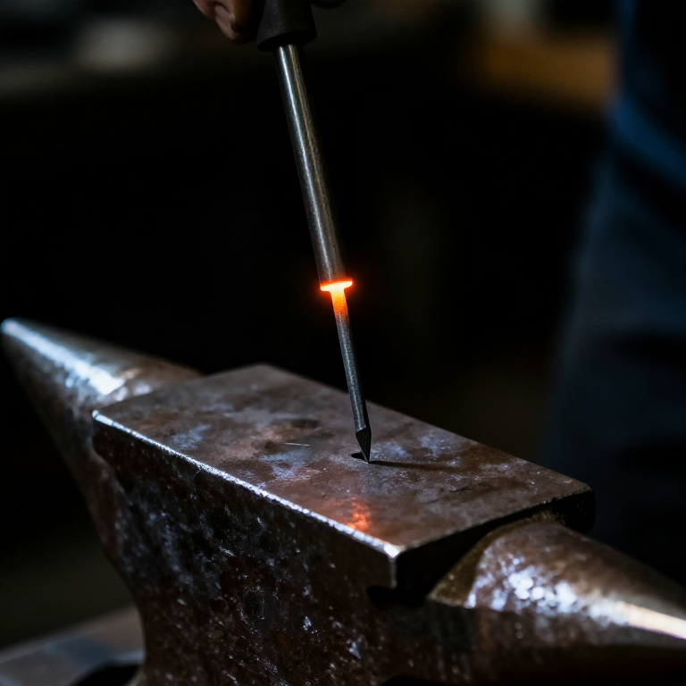 Determine the desired nail length — common Roman construction nails were approximately 7 to 12 cm long. Measure from the tip of the taper and mark the cut point by nicking the rod with the hardy (a chisel set in the anvil's hardy hole). Heat the cut area to bright orange and place the nick over the hardy edge. Strike the rod above the nick with the hammer to cut approximately three-quarters through, then bend the nail free from the parent rod with a twist. The remaining nub of metal at the cut end will be incorporated into the nail head in the next step. Leave this end slightly proud — approximately 5 to 8 mm of extra length beyond the intended shank — to provide material for forming the head.