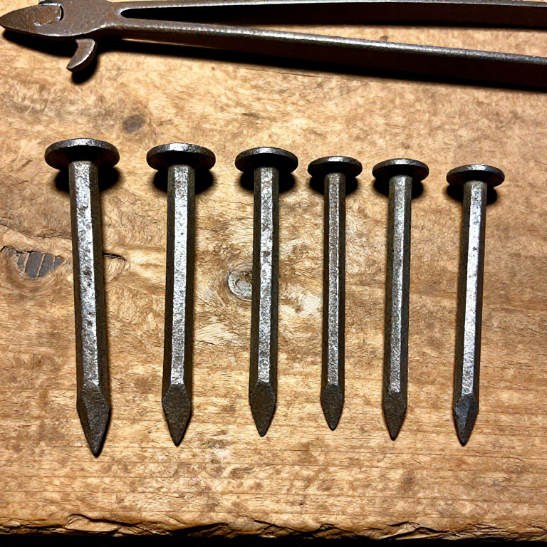 Roman iron nails were hand-forged with a distinctive square cross-section shank and flat circular or square head. They were produced in enormous quantities — the Inchtuthil Roman fortress in Scotland alone yielded a buried hoard of approximately 875,000 nails weighing 7 tonnes, deliberately buried when the legion withdrew. Roman nails ranged from small tacks to massive timber spikes over 30 cm long. This blueprint covers forging standard construction nails.