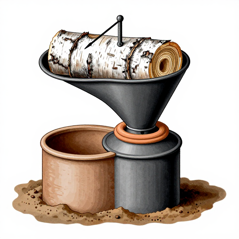 Method: Punch a small hole in the bottom of the upper pot. Pack it tightly with rolled birch bark. Place it upside-down over the lower pot (which sits in a hole in the ground to keep it cool). Seal the joint between the two pots with clay to create an airtight seal.