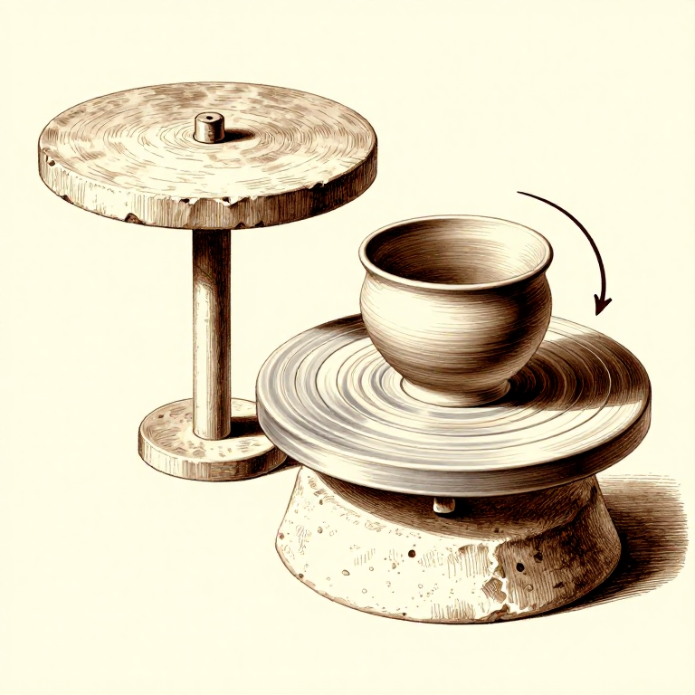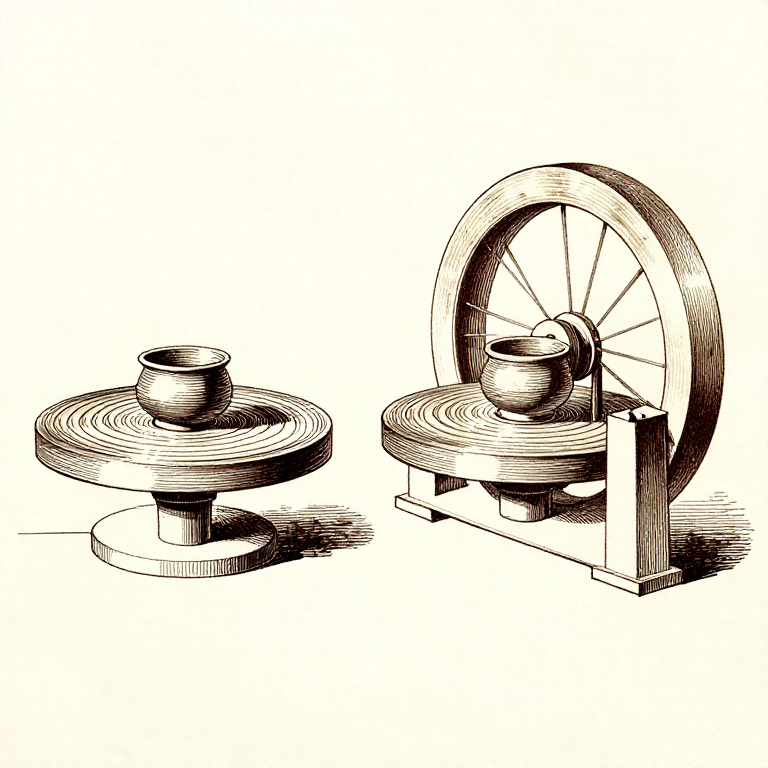 The slow wheel evolved into the fast wheel (true potter's wheel) by approximately 3500-3000 BCE in Mesopotamia through the addition of a heavy flywheel — a massive stone disc at the base that stores rotational energy and maintains speed. The fast wheel allowed true throwing, revolutionising pottery production speed and uniformity. However, the slow tournette continued in use alongside fast wheels for centuries, particularly for large vessels that were too heavy to throw. Both technologies coexisted at many ancient sites. The tournette principle — a low-friction turntable for symmetrical work — is one of the most fundamental mechanical innovations in human history and directly influenced the later development of the wheel for transport.