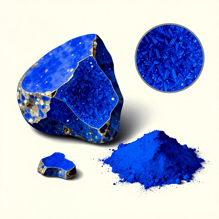 Break the sintered blue frit into small pieces with a hammer, then grind it in a stone mortar and pestle to the desired particle size. Grinding fineness affects the color: coarsely ground Egyptian blue appears as a deep, rich blue with visible sparkle from light reflecting off crystal faces, while very finely ground powder appears paler and more sky-blue. This is because the color of cuprorivaite is partially structural, not just absorptive. For painting use, a medium grind mixed with a binding medium such as gum arabic or egg tempera produces the best results. Store the finished pigment powder in a dry container. Egyptian blue is exceptionally stable — it has survived on tomb walls and sarcophagi for over 4,500 years without fading, making it one of the most lightfast pigments ever created.