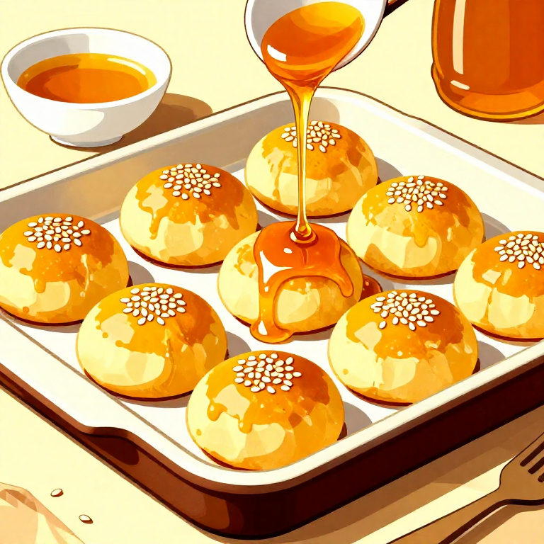 Divide the dough into small portions and shape them into flat round cakes approximately 8-10 cm in diameter and 1.5-2 cm thick. Press the reserved sesame seeds onto the tops of the cakes. Drizzle a small amount of honey over each cake. These small, individually portioned cakes were typical of Greek confections, as they were intended for sharing at symposia, festivals, and religious offerings. Larger flat cakes were cut into wedges for serving. Place the shaped cakes on a lightly oiled baking surface or ceramic tray.