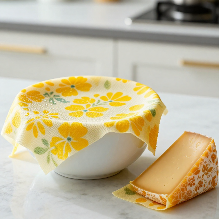 Beeswax wraps are washed in cool water with mild soap — never use hot water, which melts the wax coating. Air dry flat or hang. Do not use beeswax wraps to cover raw meat or fish (the wraps cannot be sterilized at temperatures high enough to kill pathogens). They are ideal for covering bowls, wrapping bread, cheese, sandwiches, fruits, and vegetables. With regular use, a wrap lasts approximately 6-12 months before the coating wears thin. To refresh, place the worn wrap on parchment paper, sprinkle a small amount of fresh wax blend, and re-melt in the oven. At end of life, beeswax wraps are fully compostable — they biodegrade naturally, unlike plastic cling film.