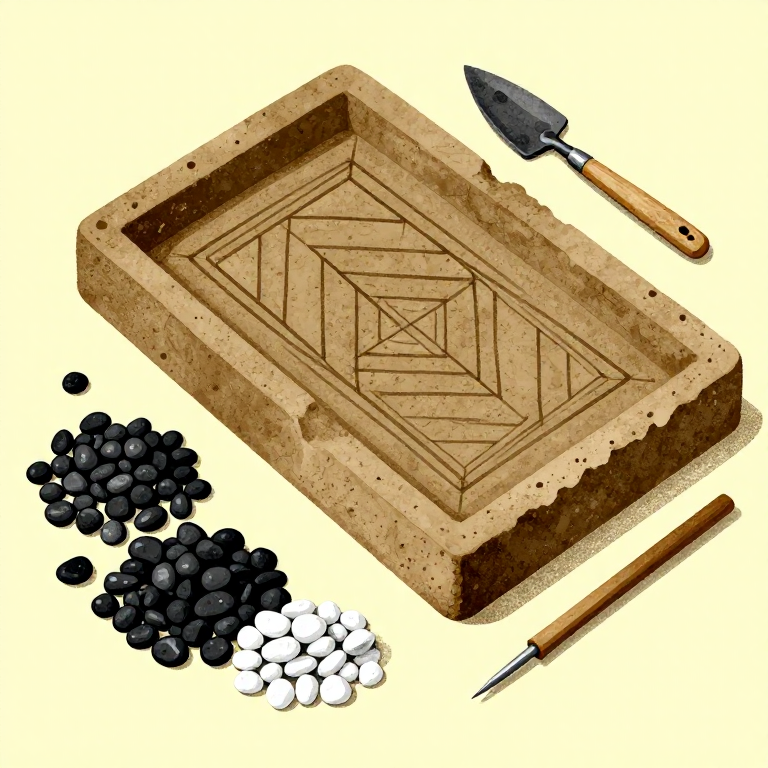 Excavate the floor area to a depth of approximately 15-20 cm. Lay a foundation of compacted coarse aggregate (gravel, broken pottery sherds, or rubble) approximately 10-12 cm deep. This drainage layer prevents moisture from wicking up through the mosaic and causing frost damage. Over the aggregate, spread a leveling layer of coarse sand approximately 3 cm thick and tamp it flat and level. Greek pebble mosaics at Olynthos (destroyed 348 BCE) and Pella (4th century BCE) were laid on carefully prepared multi-layer foundations that have survived over 2,300 years. The foundation must be perfectly level, as any unevenness will show as bumps or dips in the finished mosaic surface.