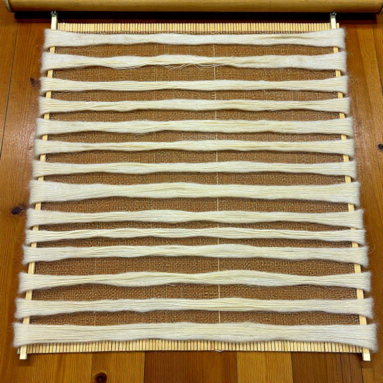 Pull thin, even wisps of carded wool from the batt and lay them on a bamboo rolling mat or sheet of bubble wrap. Create a first layer with all fibres running in the same direction (horizontal), covering the desired area with an even thickness and no thin spots or gaps. Add a second layer with fibres running perpendicular (vertical) to the first. Add a third layer with fibres running horizontal again. Three layers is the minimum for a strong felt — more layers produce thicker, firmer felt. The finished felt will shrink by approximately 30 to 40 percent in each direction during the felting process, so lay out an area correspondingly larger than the desired final size. For a hat, the layup should be approximately 50 to 60 cm square to produce a piece large enough to stretch over a hat block.