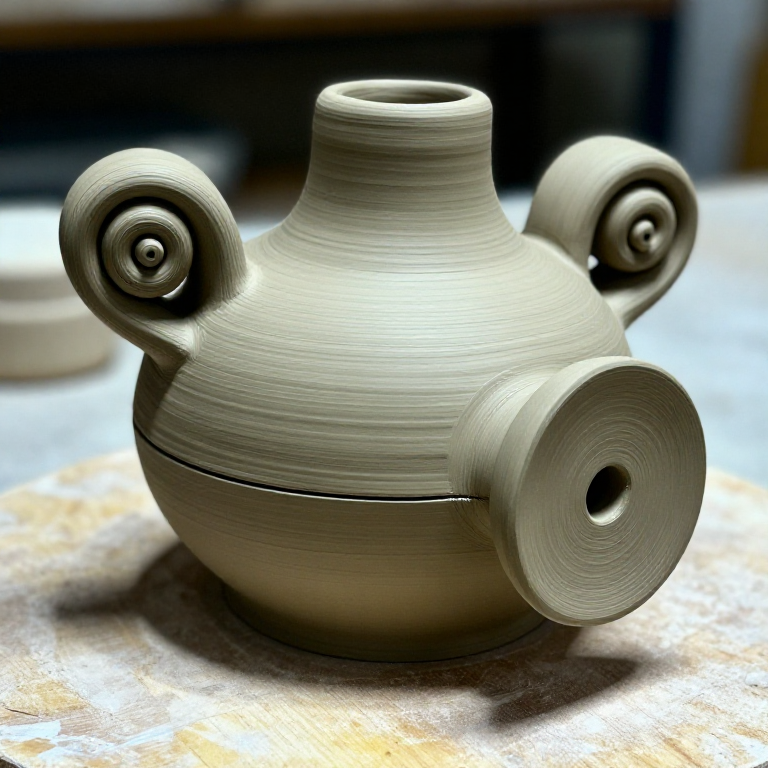 Roman oil lamps (lucerna) were the primary source of artificial light throughout the empire. The volute lamp — characterised by scroll-shaped ornaments flanking the nozzle — was the most popular type during the 1st century AD. These lamps were mass-produced in two-piece moulds, making them affordable for all social classes. They burned olive oil through a linen or papyrus wick inserted into the nozzle. This blueprint covers making a volute lamp using the press-moulding technique.