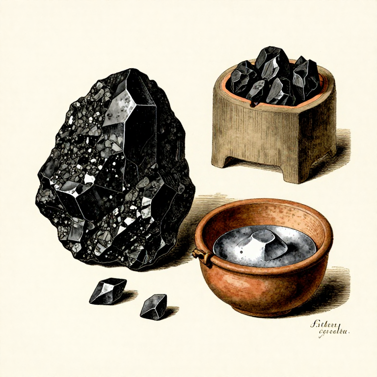Cassiterite (SnO2) is a heavy, dark brown to black mineral with an adamantine (diamond-like) lustre. It is typically found in alluvial stream deposits (stream tin) or in hard rock veins associated with granite. Alluvial cassiterite can be concentrated by panning, similar to gold — it is dense (density 7.0 g/cm3) and sinks readily in water. Crush the ore to small pieces (5-10 mm) using a hammerstone. For stream tin, the cassiterite is already in small, rounded pebbles that may only need light crushing. Cassiterite contains approximately 78 percent tin by weight, making it a remarkably rich ore.