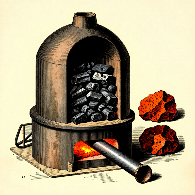 You need approximately 8-10 kg of charcoal per 1 kg of ore. Hardwood charcoal (oak, beech, birch) is best — it burns hotter and longer than softwood. Break charcoal into pieces 2-4 cm across. Total fuel needed for a 5 kg ore charge: 40-50 kg of charcoal.