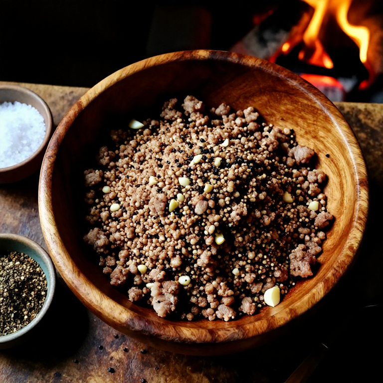 Combine the coarsely ground pork with the salt, curing salt (or medieval saltpetre — potassium nitrate — which converts to nitrite during curing), black pepper, minced garlic, and red wine in a large bowl. Mix thoroughly by kneading and folding the meat for 5 to 10 minutes until the mixture becomes tacky and cohesive — this indicates the salt has begun extracting myosin protein from the meat, which acts as a natural binder. The salt concentration of 2.5 to 3 percent by weight is critical: too little salt risks spoilage, too much produces an unpleasantly salty product. The curing salt prevents the growth of Clostridium botulinum (the bacterium causing botulism) and gives the sausage its characteristic reddish-pink cured colour by forming nitrosomyoglobin. Cover and refrigerate (or store in a cold cellar at 2-4 degrees Celsius) overnight for the cure to penetrate evenly.