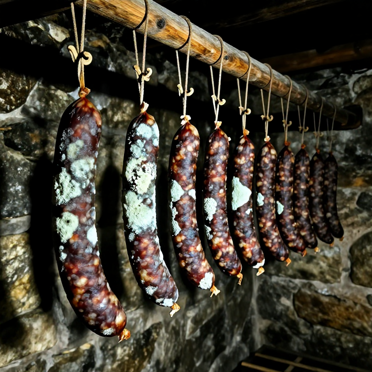 Hang the sausage links from hooks in a cool, well-ventilated space with a temperature of 10 to 15 degrees Celsius and humidity of 70 to 80 percent. A medieval root cellar, stone larder, or chimney recess provided these conditions naturally. The sausages should not touch each other or any surface to allow uniform air circulation. During the first 2 to 3 days, a beneficial white mould (Penicillium nalgiovense) may develop on the casing surface — this is desirable, as it protects the sausage from harmful moulds and contributes to flavour development. If green, black, or fuzzy coloured moulds appear, wipe them off with a cloth dampened in vinegar and improve air circulation.