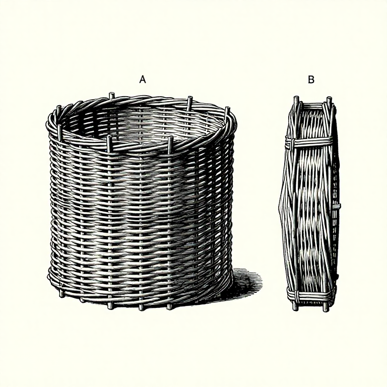Arrange 8 thick stakes in a circle, their butt ends together, forming a radiating star pattern. Begin weaving thin withies in and out of the stakes using a simple randing weave — over one stake, under the next, repeating around the circle. After every 3-4 rows, push the weaving down tight. The body should form a cylinder about 30cm in diameter and 50-60cm long. The weave gaps should be small enough that target fish cannot escape through the walls.