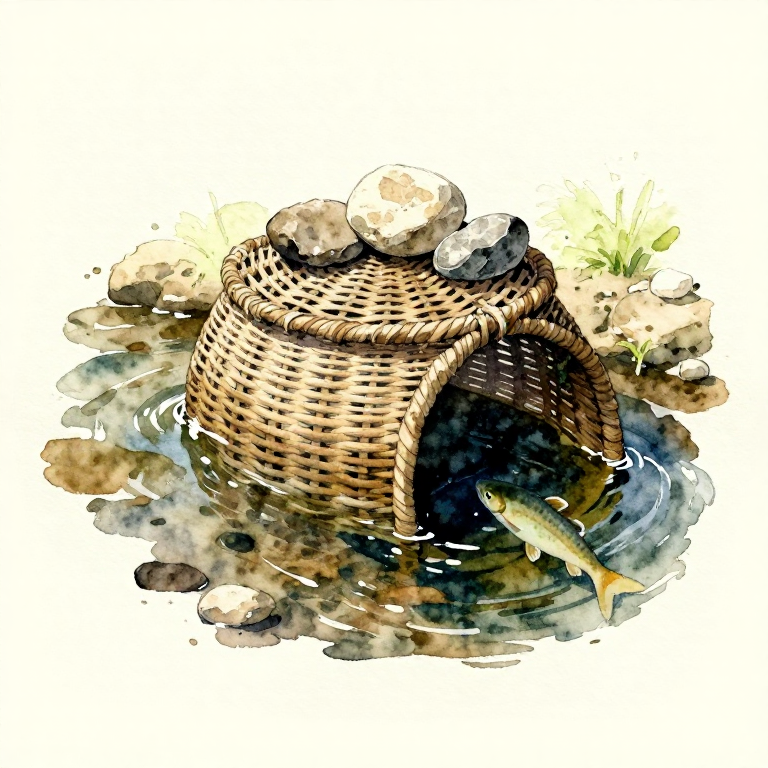 Build a funnel-entry fish trap from woven willow withies. Fish swim in through the narrow funnel opening but cannot find their way back out. This passive trap works day and night without tending.