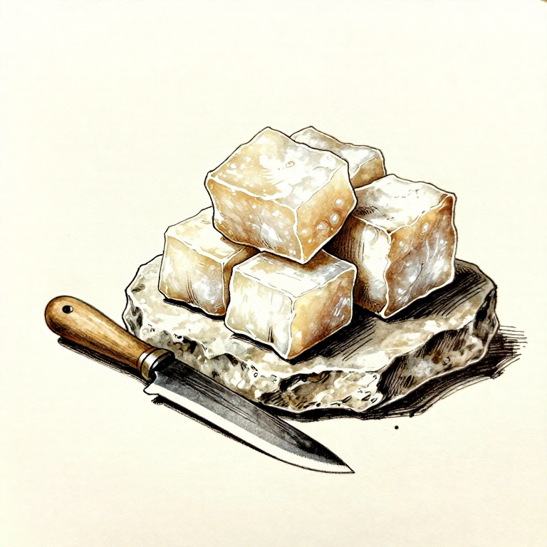 Collect the hard white fat (suet) from around the kidneys and loins of a freshly butchered animal — deer, sheep, goat, or cattle all produce usable suet. Kidney fat renders the cleanest because it has the least connective tissue. Use a sharp flint blade to cut the suet into small pieces, roughly 1-2 cm cubes. Remove any meat, membrane, or blood vessels — these impurities cause the rendered tallow to smoke and smell when burned. The smaller you cut the pieces, the faster and more completely they will render. You need approximately 500 g of raw suet to produce 300-400 g of finished tallow.
