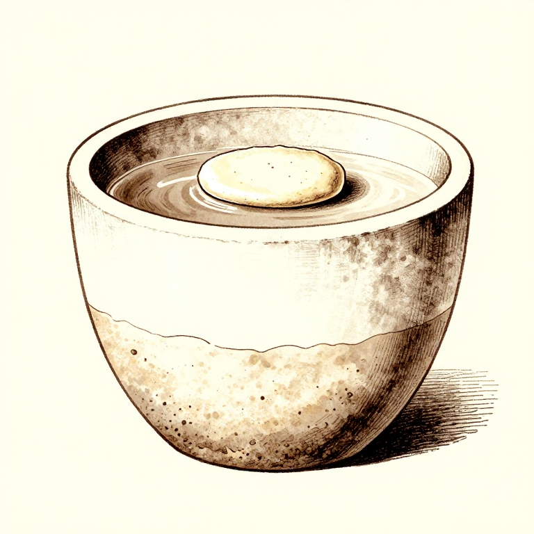 Remove the vessel from heat and allow it to cool slowly. As it cools, the tallow solidifies on top of the water as a white or off-white disc, while the impurities and water remain below. Lift the solidified tallow disc off the water surface, scrape any brown residue from the underside, and discard the water and cracklings. For higher purity, re-melt the tallow disc by hot-stone boiling in fresh water and allow it to solidify again — each cycle removes more impurities. Well-rendered tallow is white to pale yellow, has a mild meaty smell, and is firm at room temperature. It can be stored in bark containers or clay pots for several months without turning rancid, especially in cool conditions.