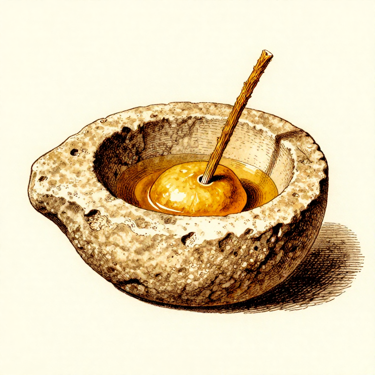 Place the chopped suet into a watertight vessel — a tightly woven bark container, a stone bowl, or a clay pot — and add an equal volume of water. Heat the mixture by dropping fire-heated stones into it (the hot-stone boiling method). As the water heats to a gentle simmer, the fat cells rupture and release liquid fat, which floats to the surface. Continue adding hot stones to maintain the simmer for 1-2 hours. The water method is important: it prevents the fat from scorching, dissolves water-soluble impurities, and produces a cleaner tallow than dry rendering. The connective tissue (cracklings) sinks to the bottom along with any debris.
