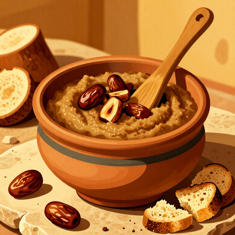 Chop the pitted dates into small pieces and add them to the bread mash. Dates (Phoenix dactylifera) contain approximately 60-70% sugar by dry weight, primarily glucose and fructose, which are directly fermentable by yeast without enzyme conversion. They also carry natural yeasts on their skin that can initiate fermentation. Stir the dates into the mash thoroughly and add remaining water to bring the total to a thin, soupy consistency. The mixture should be liquid enough to strain later but thick enough that the bread fragments are fully saturated. Date-sweetened beer is attested in Egyptian texts from the Old Kingdom onward, and date residues have been identified in beer vessels by chemical analysis.