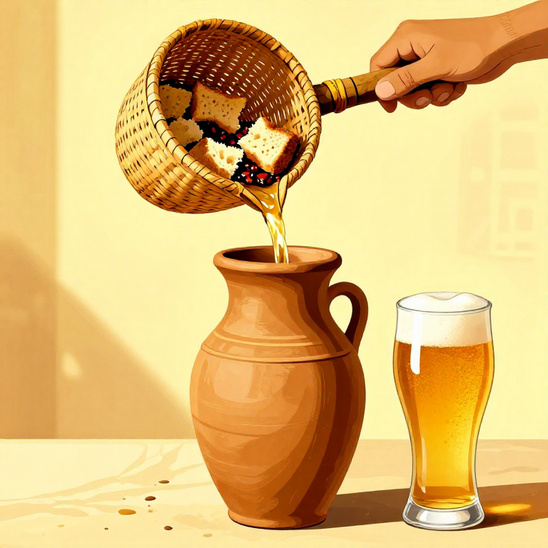 Once fermentation is active and the mash has a pleasantly sour, yeasty smell, strain the liquid through a woven basket strainer or a piece of loosely woven linen into a clean vessel. Press the solids firmly to extract as much liquid as possible. The resulting beer will be cloudy, tan to golden in color, with a thick, almost porridge-like consistency — quite different from modern clear beer. Egyptian brewery models and tomb paintings frequently depict the straining process, with workers pouring mash through basket filters into tall storage jars. The beer should taste mildly sweet from the dates, slightly sour from lactic acid fermentation, with a low alcohol content of approximately 3-5% ABV.
