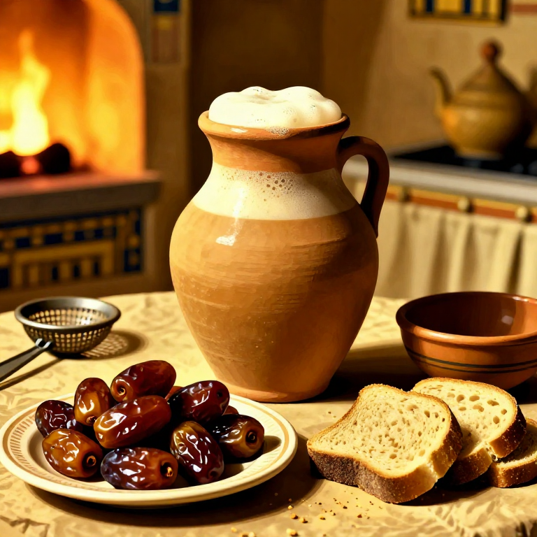 Egyptian beer was consumed fresh, usually within 1-3 days of brewing, as it lacked the hops that preserve modern beer. Pour the strained beer into clean ceramic cups or bowls for serving. It should be thick and slightly effervescent, with a sweet-sour flavor. In ancient Egypt, beer was often drunk through long straws made from reed to filter out remaining sediment — this practice is depicted on cylinder seals and tomb reliefs. For short-term storage, seal the beer in a clay vessel with a mud stopper. Beer was so central to Egyptian society that it was offered to the gods in temples, included in tomb provisions, and used as payment — records from Deir el-Medina show workers received a daily ration of approximately 4-5 liters of beer.