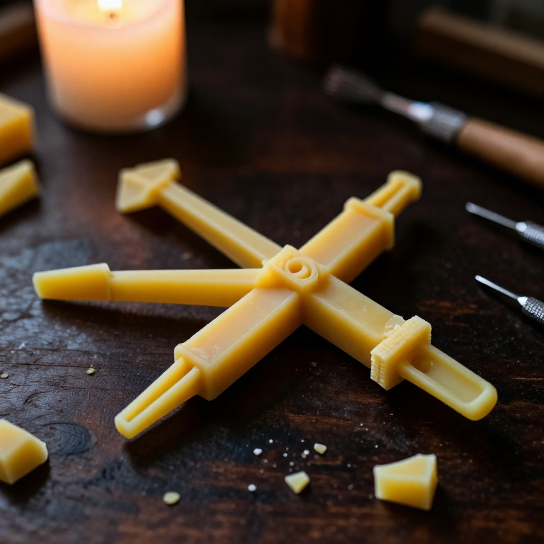Warm the beeswax until pliable and shape the crossbow fibula form. Start with the transverse crossbar — a rod approximately 5 to 6 cm long. At each end of the crossbar, form an onion-shaped bulb (approximately 8 mm diameter) by rolling a ball of wax and pressing it onto the rod end. From the centre of the crossbar, extend the arched bow (approximately 3 cm long) curving down to the long foot (approximately 6 cm), which ends in a flat catch plate where the pin will rest when closed. Carve any decorative elements — Roman crossbow fibulae often featured incised geometric patterns, ring-and-dot motifs, or faceted surfaces on the foot and onion terminals. Attach a wax rod (sprue) approximately 3 mm diameter from the foot to serve as the pouring channel, and add a smaller vent rod from the crossbar to allow air escape during casting.