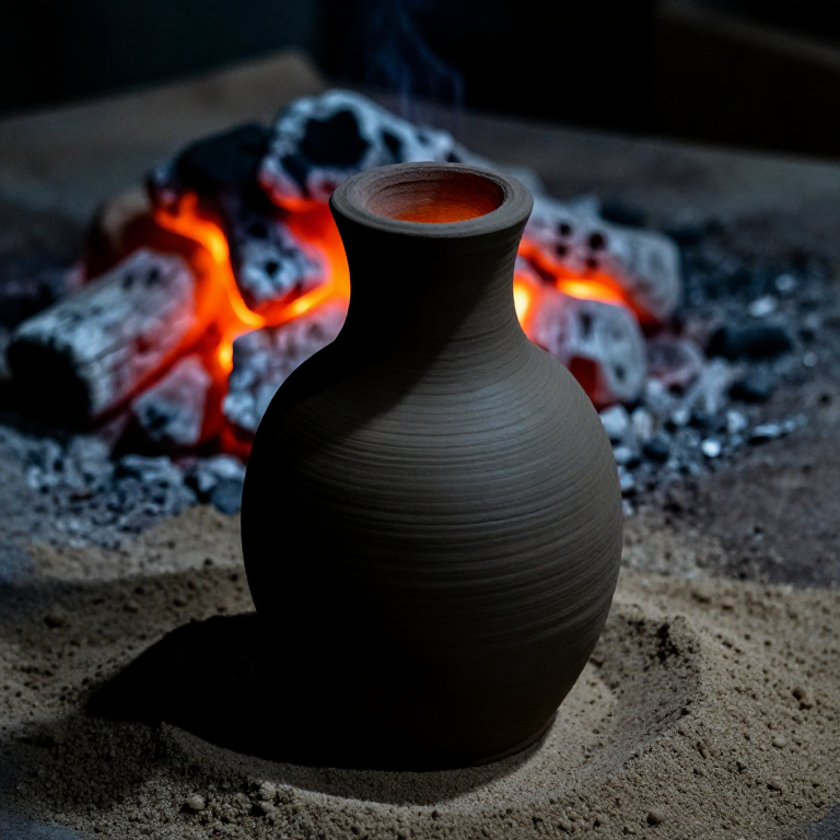 Place the mould upside-down (sprue opening facing down) in a kiln or over a charcoal fire and slowly raise the temperature to approximately 300-400 °C. The beeswax will melt and drain out through the sprue opening — collect it for reuse. Continue heating the mould to approximately 600-700 °C to burn out any wax residue and fire the clay to a hard ceramic. The mould interior now contains a perfect negative impression of the fibula. Keep the mould at temperature or allow it to cool to approximately 400 °C before pouring — casting into a warm mould reduces thermal shock and allows the bronze to flow into thin sections more easily. Position the mould upright with the sprue opening at the top, ready to receive the molten metal.