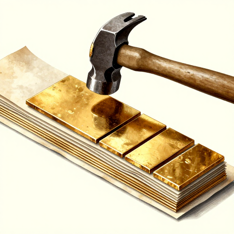 Master the ancient Egyptian technique of beating gold into extraordinarily thin leaf for gilding surfaces. Egyptian goldbeaters produced leaf as thin as 1 micron — thinner than a human red blood cell — using repeated hammering and folding between animal-skin interleaves, a process depicted in tomb paintings at Saqqara.