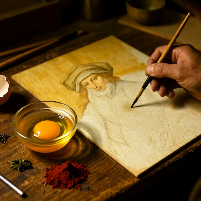 Create egg tempera paint, the primary painting medium of European art from the early medieval period through the 15th century, used for icons, altarpieces, and panel paintings by artists including Giotto, Duccio, and Botticelli. Egg tempera uses fresh egg yolk as the binding medium — the yolk contains natural emulsifiers (lecithin), oils, and proteins that bind pigment to a surface and dry to a hard, luminous film within minutes. The fast drying time requires a technique of building up colour in many thin, semi-transparent layers (glazes), producing a characteristic inner glow that oil paint cannot replicate.