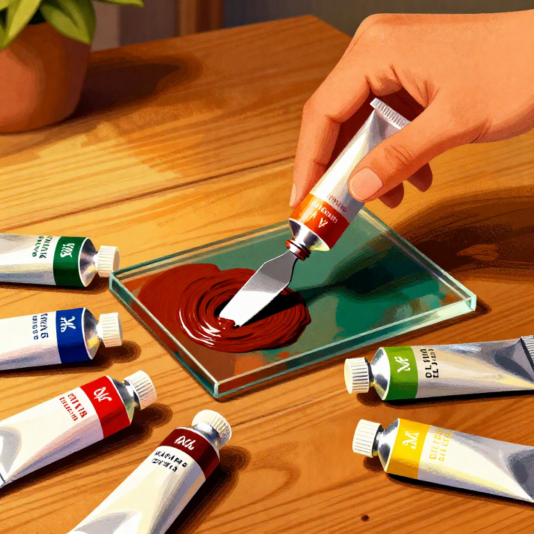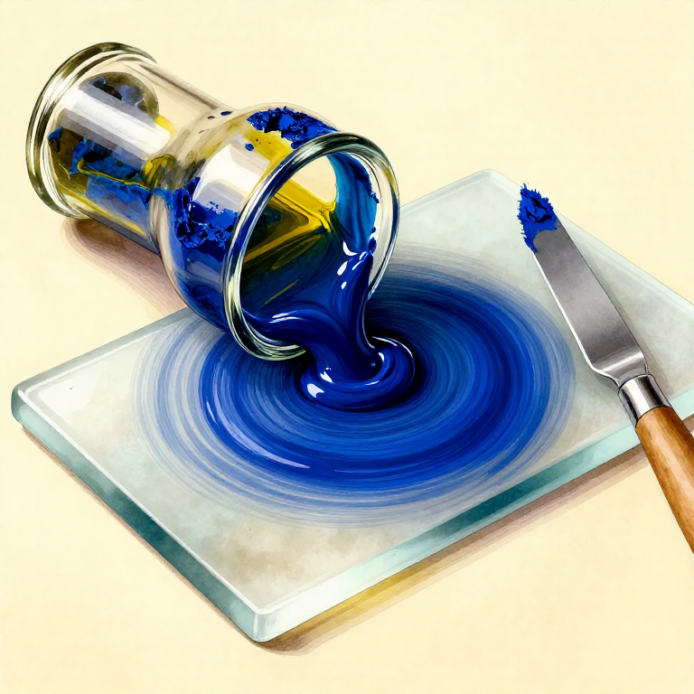 After 5-10 minutes of grinding, test the paint's consistency: pick up a small amount on the palette knife and draw it across a clean area of the glass slab. A properly ground oil paint should spread smoothly with no visible gritty particles and no streaks of undispersed pigment. The texture should be buttery and homogeneous — similar to thick cream or soft butter. If the paint is too stiff: add a few drops of oil and grind again. If the paint is too runny: you have added too much oil — add more dry pigment and grind again. Some pigments (e.g. raw umber, burnt sienna) grind quickly to a smooth paste in minutes; others (e.g. viridian, ultramarine) are harder and require 15-20 minutes of sustained grinding. Titanium white is notoriously stiff and requires patient, firm grinding.