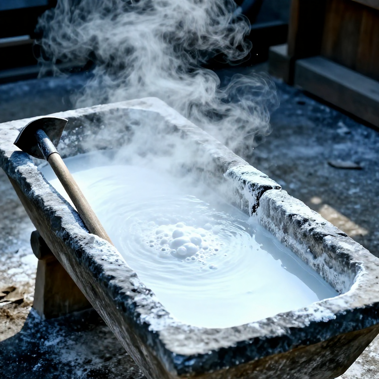 Place the quicklime lumps in a large stone or metal trough outdoors. Gradually add water while standing well back — the reaction between calcium oxide and water is violently exothermic, producing temperatures exceeding 150 degrees Celsius with vigorous boiling, steaming, and spattering. Add water in stages, stirring with a long-handled hoe between additions. The quicklime will swell, crack, and eventually dissolve into a thick, white paste of calcium hydroxide (slaked lime putty). Continue adding water and stirring until all lumps have dissolved and the mixture has the consistency of thick cream. Wear heavy gloves and eye protection at all times — both quicklime and slaked lime cause severe chemical burns on contact with skin and eyes. Medieval lime-burners and masons suffered frequent burns from this process.