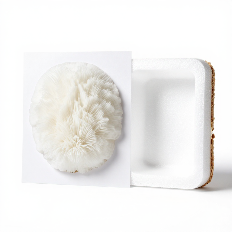 To halt growth and prevent the material from producing mushroom fruiting bodies (which would deform the packaging), heat-kill the mycelium by placing the formed piece in an oven at 80-100 degrees C for 2-4 hours. This dries the material and kills the fungal organism while preserving the structural integrity of the mycelium network. The finished material is lightweight (density approximately 50-100 kg per cubic metre, comparable to expanded polystyrene), insulating, shock-absorbing, fire-resistant (mycelium does not melt or produce toxic fumes like polystyrene), and fully compostable. It decomposes in a home compost or garden soil within 30-90 days, returning nutrients to the soil rather than persisting as plastic waste for centuries.